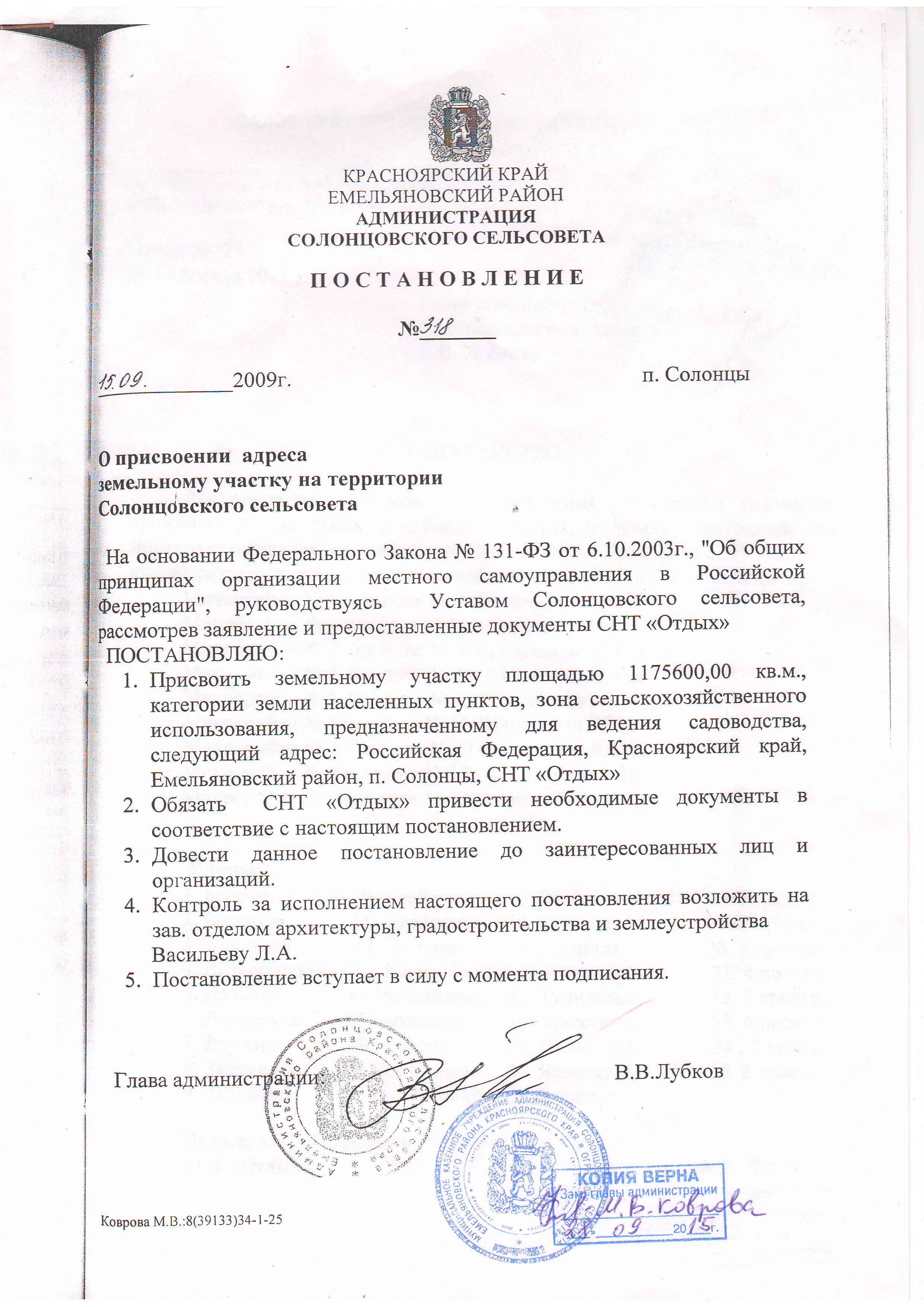 - Постановление администрации Солонцовского Сельсовета № 318 от 15.09.2009 г. " О присвоении адреса земельному участку на территории Солонцовского сельсовета" cкачать файл (JPG, 860 КБ)