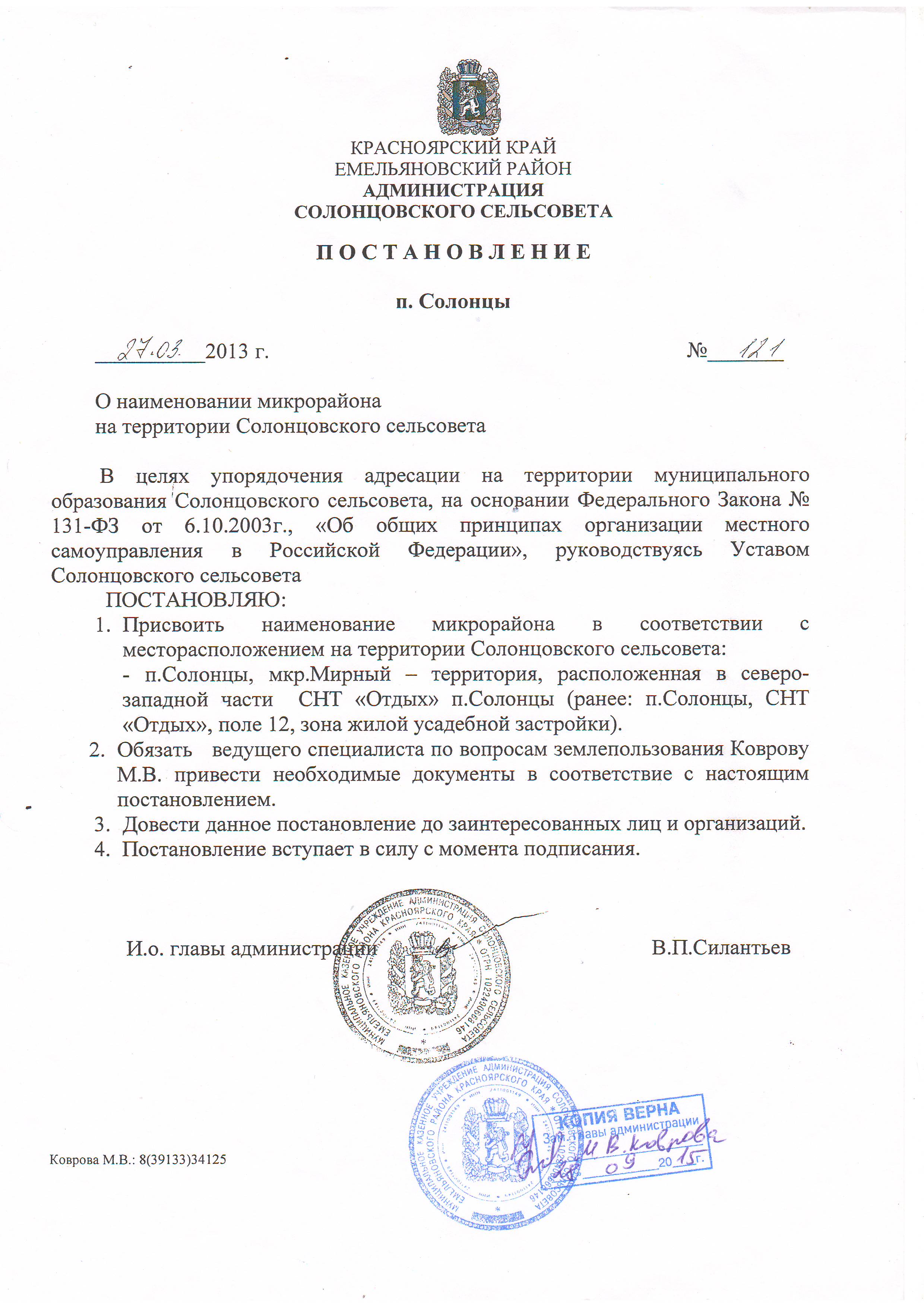 - Постановление администрации Солонцовского Сельсовета № 121 от 27.03.2013 г. " О наименовании микрорайона на территории Солонцовского сельсовета " cкачать файл (JPG, 697.3 КБ)