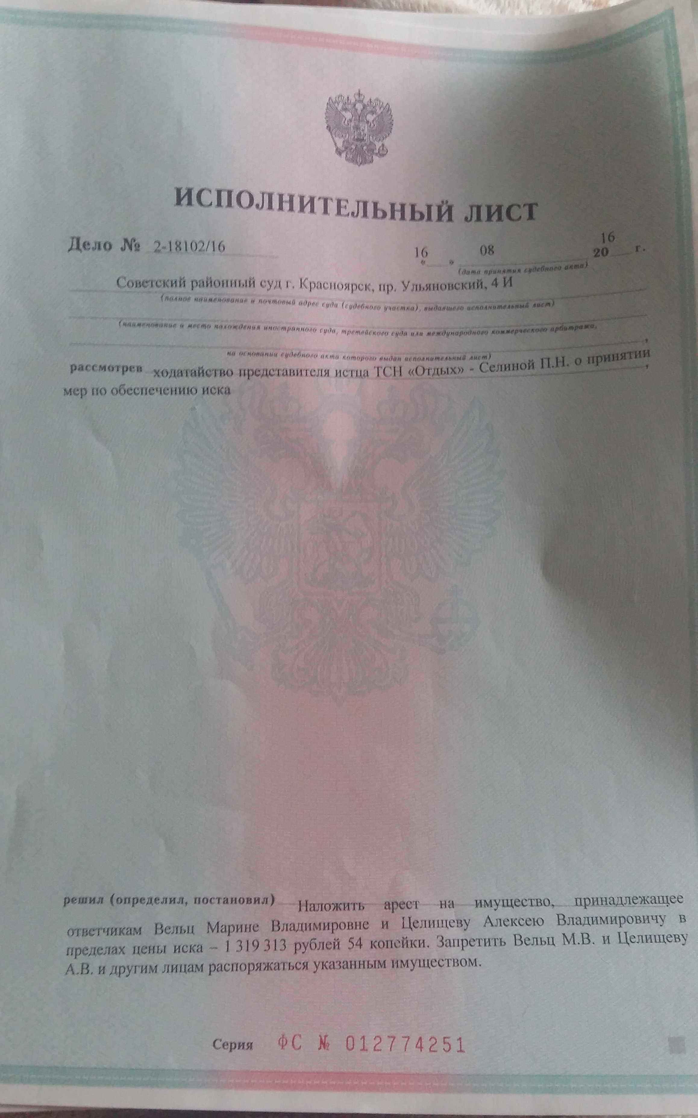- Исполнительный лист о запрете Вельц Марине Владимировне собирать наличные деньги с граждан от лица ТСН cкачать файл (PDF, 3.7 МБ)